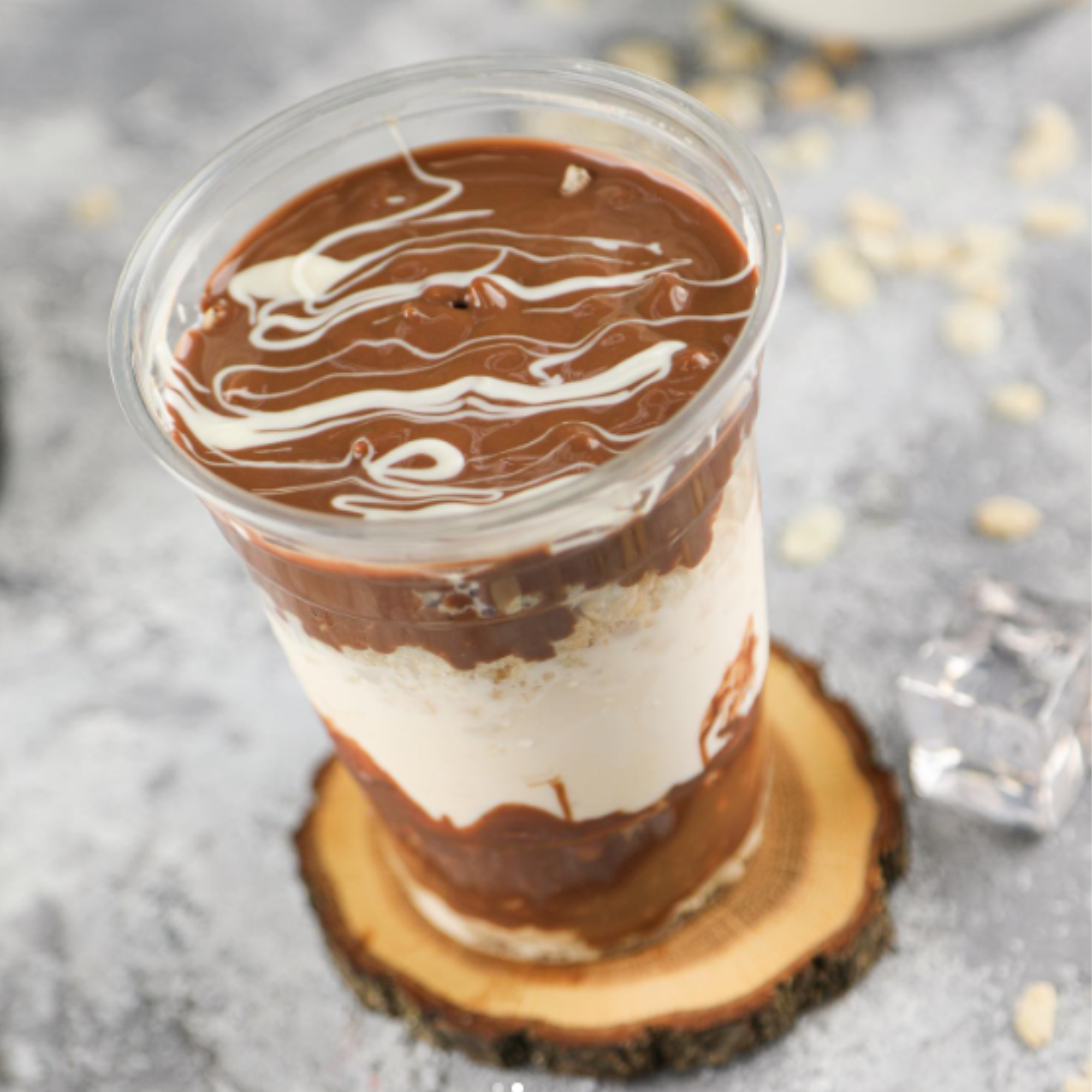 Cake crumbs, topped with kunafa & pistachio mix, & drizzled with white & milk chocolate.