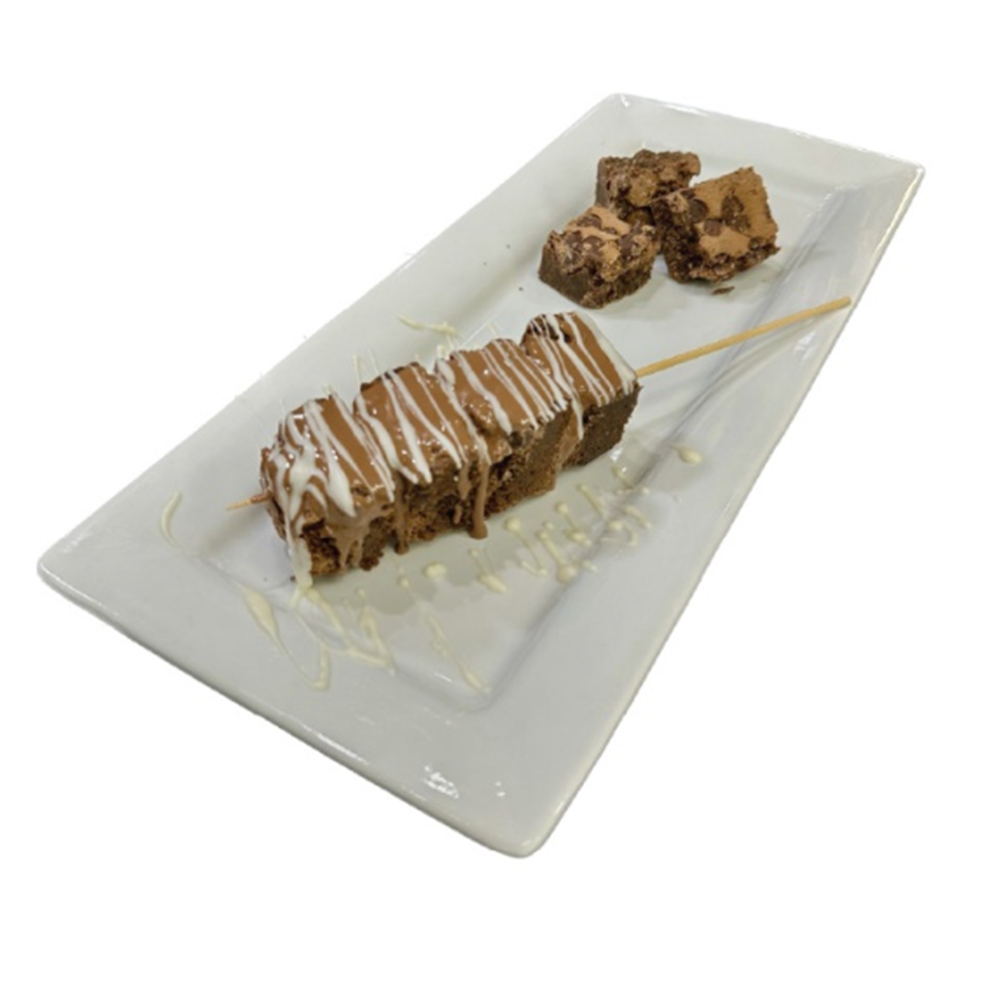Chocolate cake & banana, topped with milk chocolate & drizzled with white & dark chocolate.